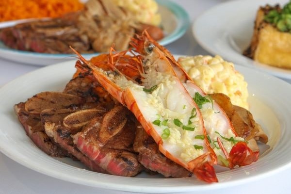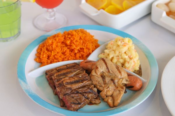 メイン料理:プレート式(大人:ショートリブ、照焼チキン、海老、パスタサラダ、レッドライス、子供は海老の代わりにソーセージ)